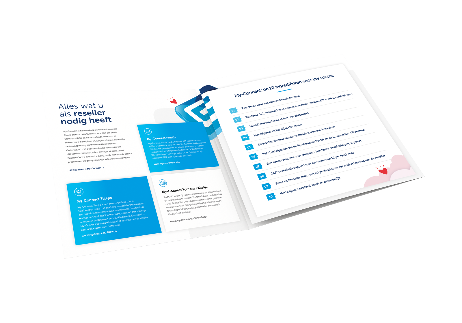 Met My-Connect leveren we een concept dat uniek is in de markt voor business partners: een breed pallet aan Cloud-diensten puur voor resellers, met aanvullende hardware te bestellen via dezelfde portal, ondersteund met de professionele kennis van een uitgebreid presales-, sales- en support-team. Dat is My-Connect van BusinessCom.